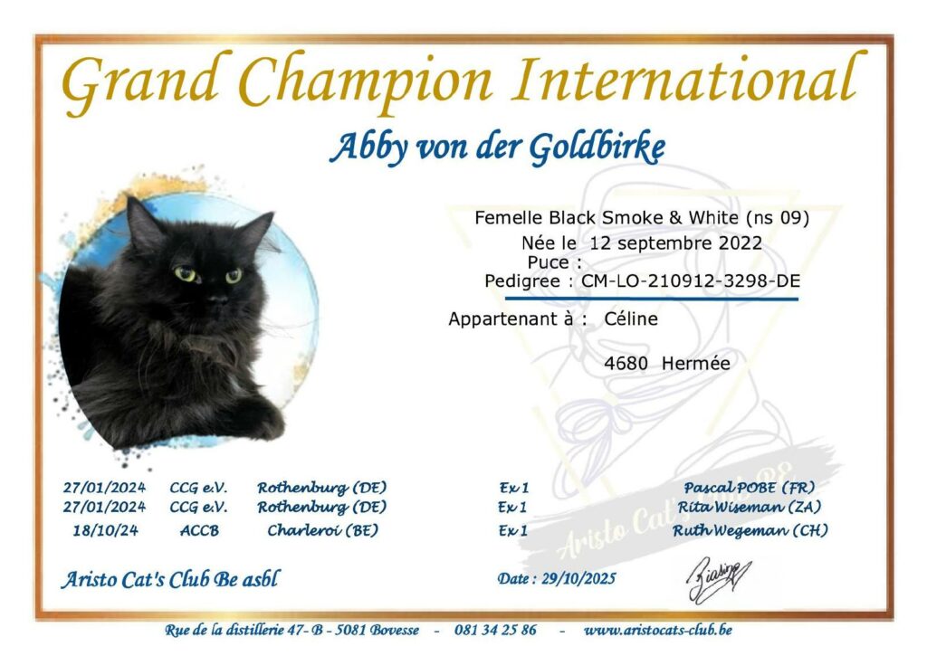 Abby est née le 12 septembre 2022. Elle est arrivée d’Allemagne le 7 février 2025. C’est une magnifique femelle déjà Championne Internationale malgré son jeune âge. Elle a été nominée à plusieurs reprises en catégorie Best in Show.